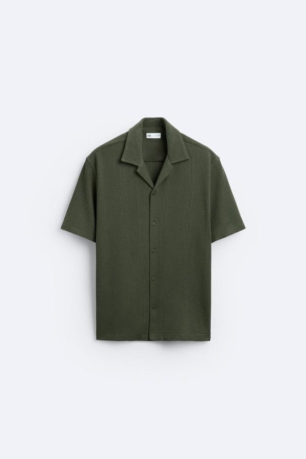 Relaxed fit collared shirt made of textured fabric. Short sleeves with button-up front